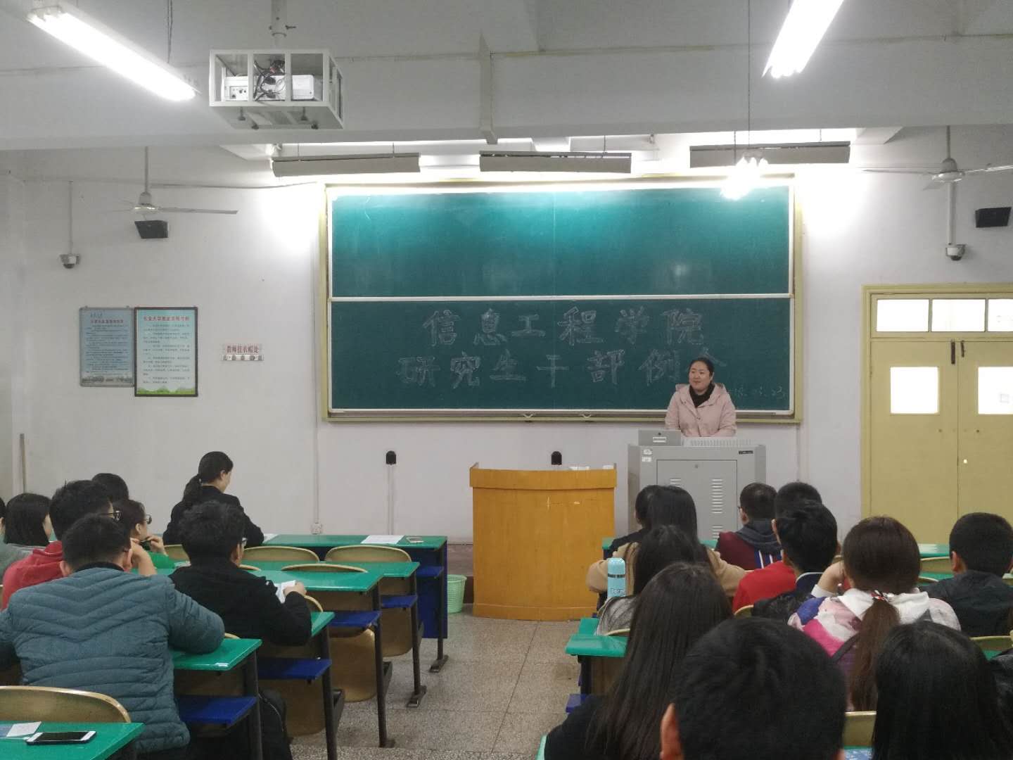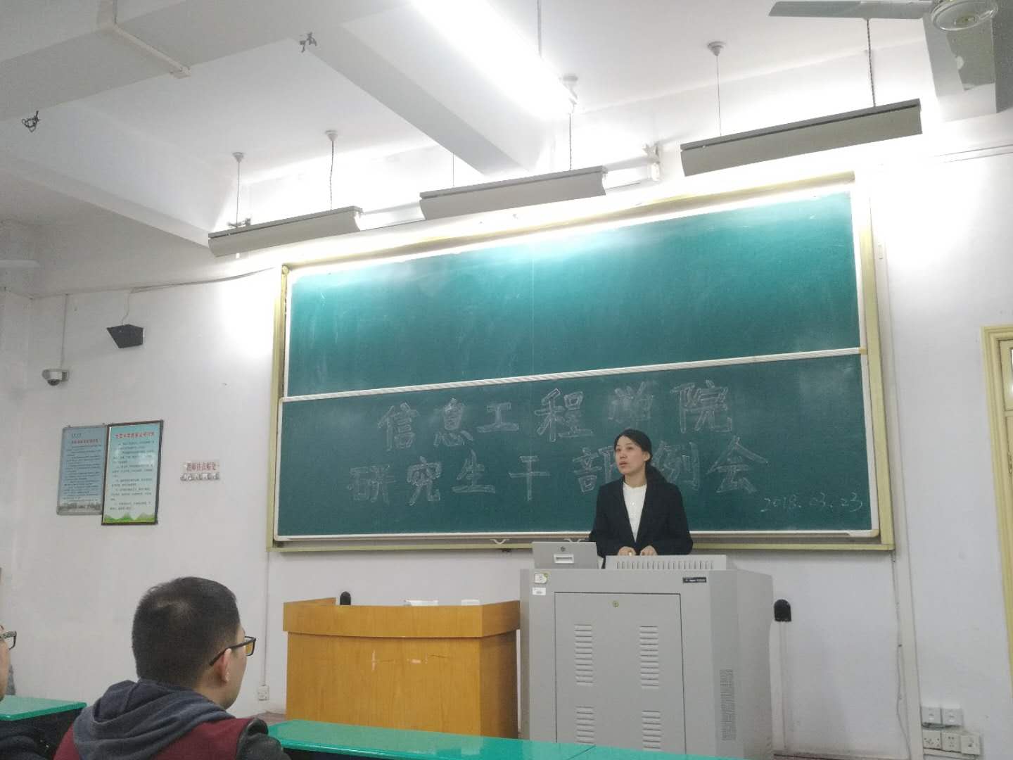 2018年3月23日,我院研究生全体学生干部例会在校本部181教室召开。参加本次例会的领导和老师有:院党委副书记陈晏老师、院学生工作办公室主任黄亚男老师、研究生辅导员刘松鹤老师,以及所有的研究生兼职辅导员、党团、社团干部和班委成员七十余人。